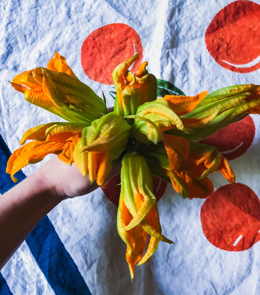 12 zucchini flowers, stamens and stems removed, flower cut on one side so that it opens like a sheet